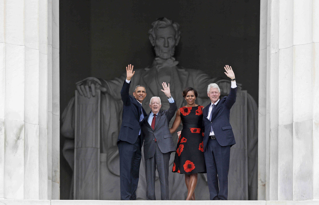 FILE - From left, President Barack Obama, former President Jimmy Carter, first lady Michelle Obama and former President Bill Clinton wave from the Lincoln Memorial in Washington during a celebration of the 50th anniversary of the March on Washington where Martin Luther King Jr. spoke, Aug. 28, 2013. (AP Photo/Charles Dharapak, File)