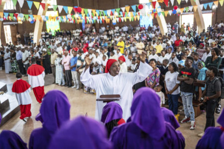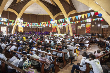 Parishioners attend a mass in honour of the late Pope Francis at the Catholic Church in Goma, Democratic Republic of Congo, Saturday, April 26, 2025. (AP Photo/Moses Sawasawa)
