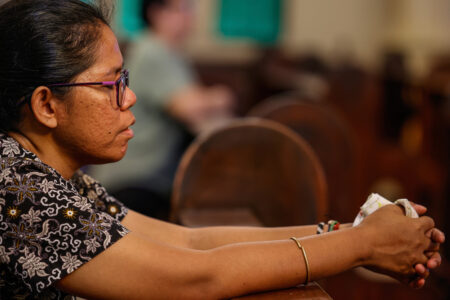 A Catholic devotee prays during the papal funeral public viewing at the Sacred Heart Parish Church in Quezon City, Philippines, Saturday, April 26, 2025. (AP Photo/Gerard Carreon)