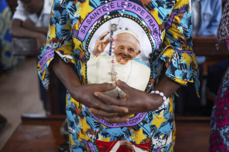 - A parishioner wears clothes with a portrait of the late Pope Francis during a mass at the Catholic Church in Goma, Democratic Republic of Congo, Saturday, April 26, 2025. (AP Photo/Moses Sawasawa)