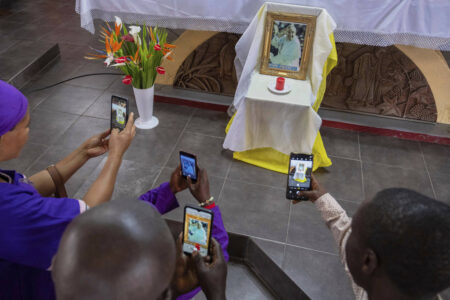 - Parishioners takes pictures of the late Pope Francis’ portrait after a mass at the Catholic Church in Goma, Democratic Republic of Congo, Saturday, April 26, 2025. (AP Photo/Moses Sawasawa)