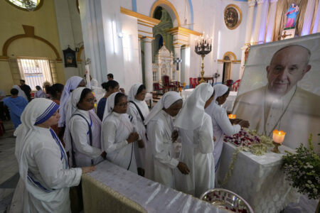 - Catholic nuns pay tribute at a portrait of the late Pope Francis after a service at the Cathedral of The Most Holy Rosary, in Kolkata, India, Saturday, April 26, 2025. (AP Photo/Bikas Das)