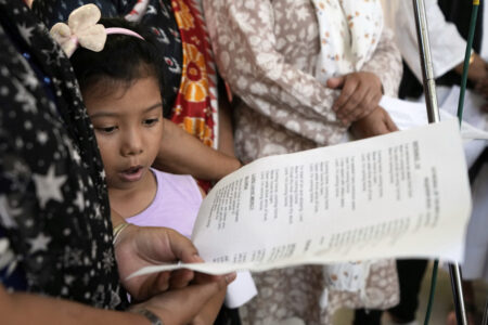 A little Catholic girl sings in the choir as during a service for the late Pope Francis at the Cathedral of The Most Holy Rosary, in Kolkata, India, Saturday, April 26, 2025. (AP Photo/Bikas Das)