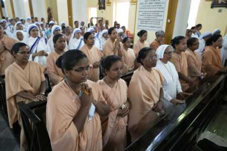Catholic nuns of the Missionaries of Charity, the order founded by Saint Teresa, attend a service for the late Pope Francis at the Cathedral of The Most Holy Rosary, in Kolkata, India, Saturday, April 26, 2025. (AP Photo/Bikas Das)