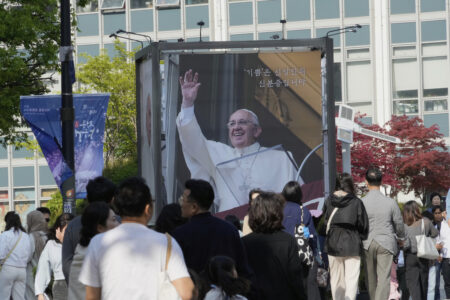 - A portrait of the late Pope Francis is displayed outside Myeongdong Cathedral in Seoul, South Korea, Saturday, April 26, 2025.(AP Photo/Ahn Young-joon)