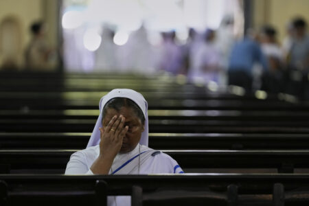 A Catholic nun prays as she attends a service for the late Pope Francis at the Cathedral of The Most Holy Rosary, in Kolkata, India, Saturday, April 26, 2025. (AP Photo/Bikas Das)