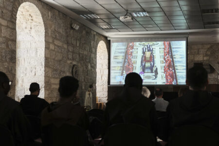 - People watch a live broadcast of the funeral procession of Pope Francis in the the Vatican, at the Saint Saviour’s Convent in Jerusalem’s Old City, Saturday, April 26, 2025. (AP Photo/Mahmoud Illean)