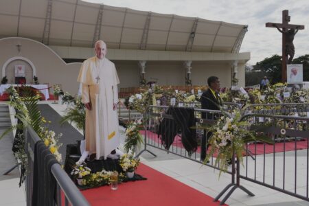 A cutout of Pope Francis is displayed ahead a Requiem Mass in Dili, East Timor, Saturday, April 26, 2025. (AP Photo/Firdia Lisnawati)