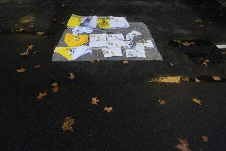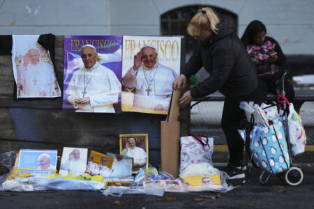 Images of the late Pope Francis are displayed for sale outside the Cathedral in Buenos Aires, Argentina, Saturday, April 26, 2025, as his funeral takes place in Rome. (AP Photo/Natacha Pisarenko)