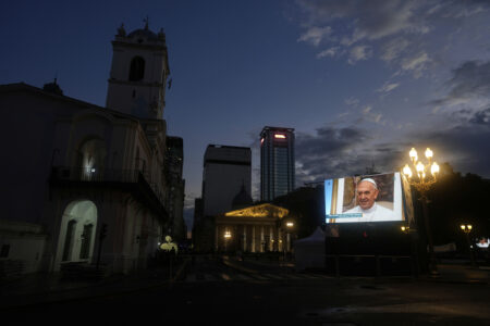 An image of the late Pope Francis is projected on a screen outside the Cathedral in Buenos Aires, Argentina, Saturday, April 26, 2025, as his funeral takes place in Rome. (AP Photo/Natacha Pisarenko)