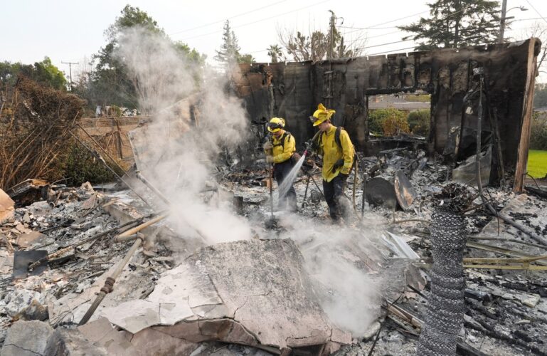 Four days after powerful winds gave fuel to what began as small fires in the Los Angeles area, on Friday fighthers were fighting several blazes in some places while in others evacuees returned to what was left of their homes.
