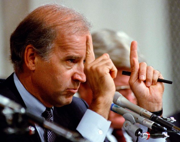 ADVANCE FOR PUBLICATION ON SUNDAY, AUG. 18, AND THEREAFTER – FILE – In this Oct. 12, 1991, file photo, Senate Committee Chairman Joseph Biden, D-Del., gestures during hearings before the committee on allegations of sexual harassment by Supreme Court nominee Clarence Thomas on Capitol Hill in Washington. (AP Photo/Greg Gibson, File)