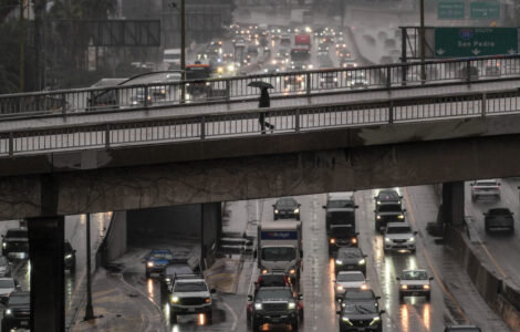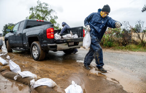 LOS ANGELES (AP) — An unusually strong storm system called an atmospheric river doused Southern California on Saturday, prompting flood warnings in areas of coastal Los Angeles County that recently were ravaged by wildfire.