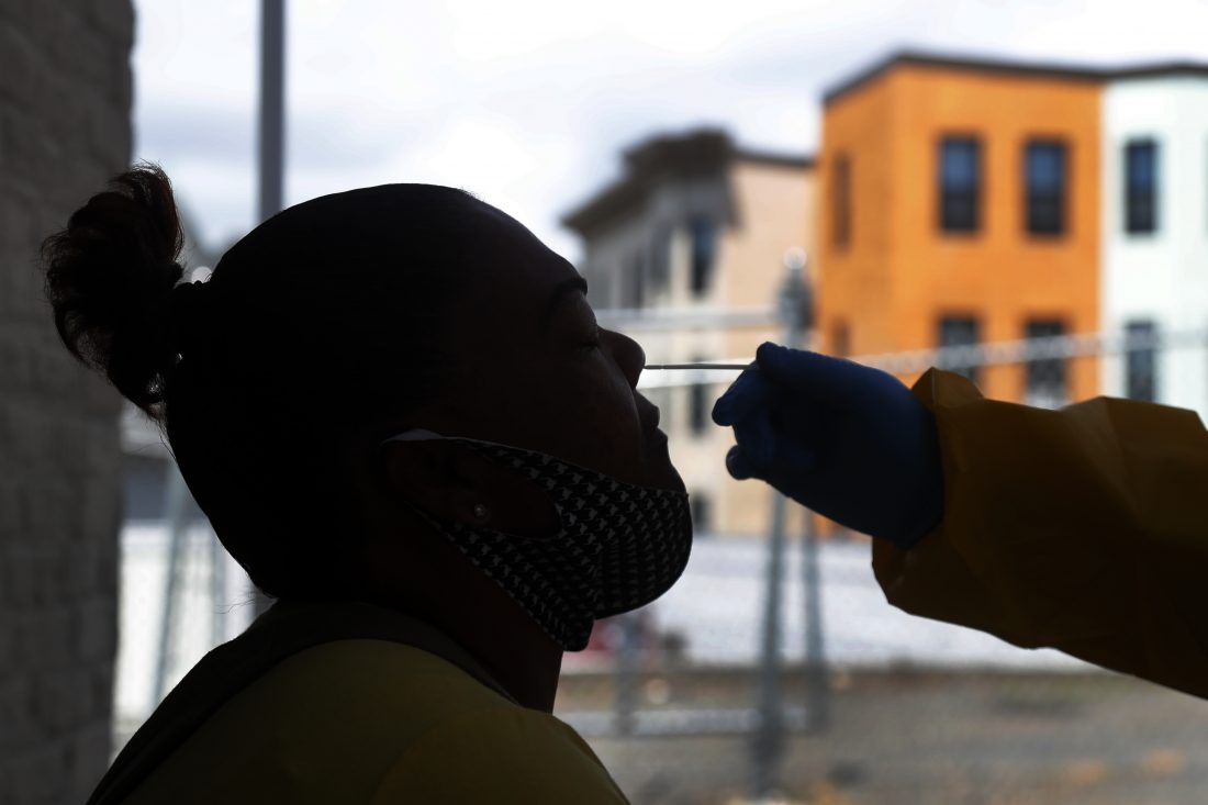 Evelinda Villegas receives a COVID-19 test at the Whittier Street Health Center's mobile test site, Wednesday, July 15, 2020, in Boston's Dorchester section. The health center has administered free COVID-19 tests to over 5,000 people. The tests, administered since April 13, have been a popular service in Boston's low-income communities that have experienced high rates of infection. (AP Photo/Elise Amendola)