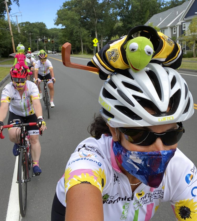 In this July 31, 2020 photo, Pan-Mass Challenge bike rider Celia Donatio, right, cycles with her teammates through Needham, Mass. "Team Kermit" raised close to $554,000 for Dana Farber Cancer Research. PMC founder Billy Starr knew he wouldn't be able to get 10,000 people together this summer for the annual cross-state bike ride that has raised more than $700 million for cancer research. But he also knew he couldn't take the year off. While other events in the $1.4 billion participatory fundraising field shut down during the coronavirus outbreak, the PMC delivered $50 million for the Dana-Farber Cancer Institute. (Photo by Celia Donatio via AP)