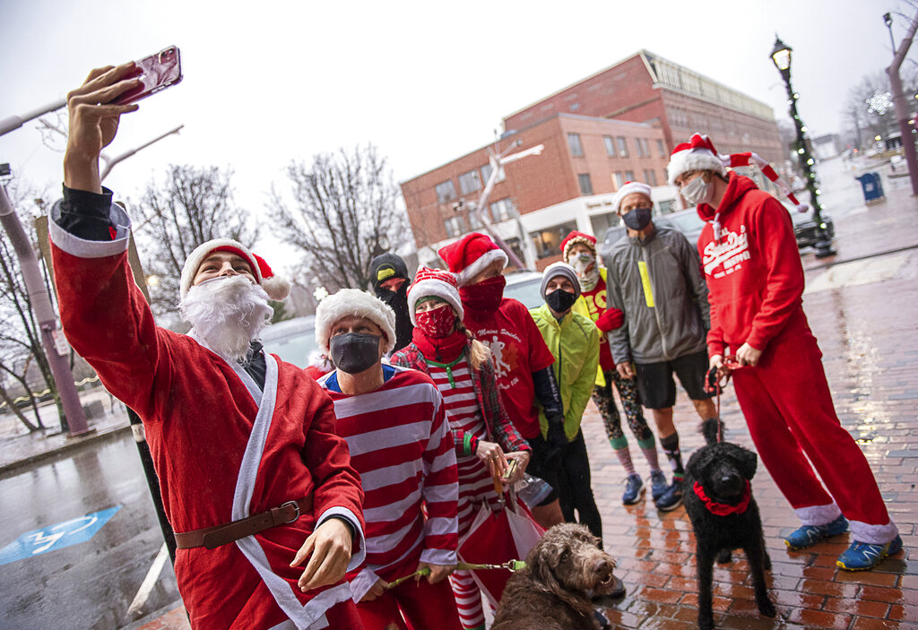 Maxi Kolb, an exchange student from Germany, takes a photo of a group of Santas and elves getting ready for their annual Christmas morning run on Main Street in Auburn, Maine on Friday, Dec. 25, 2020. The group gets together every Christmas morning and runs a loop through Lewiston Auburn. (Andree Kehn/Sun Journal via AP)