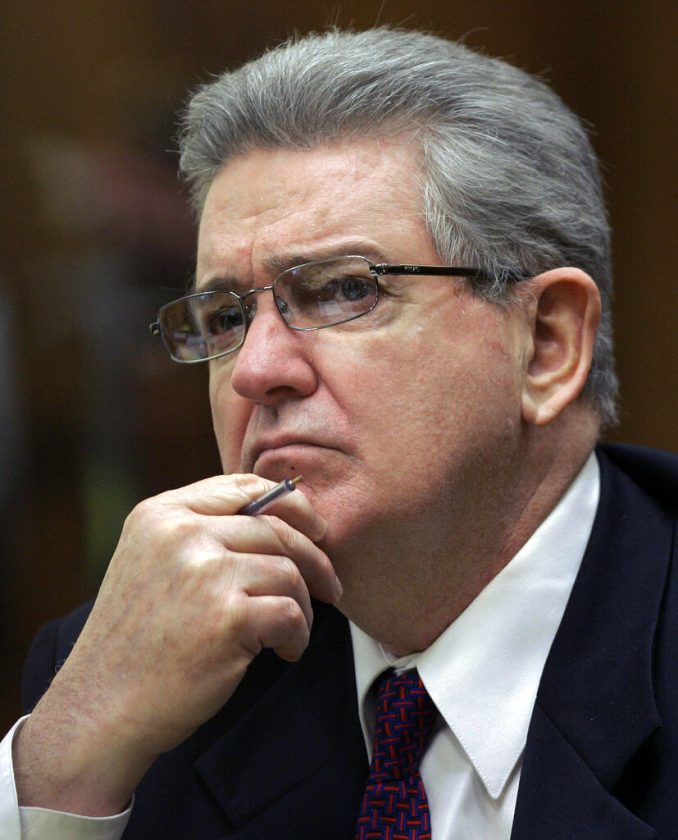 FILE- In this Oct. 15, 2008 file photo, former FBI agent John Connolly listens to the testimony during his trial in Miami. The imprisoned former FBI agent serving a 40-year prison sentence for alerting former Boston mobster Whitey Bulger that he could implicated in a mob murder wants to be released from prison on medical grounds. Connolly will ask the Florida Commission on Offender Review Wednesday, Feb. 17, 2021 to release him. (AP Photo/Alan Diaz, File)