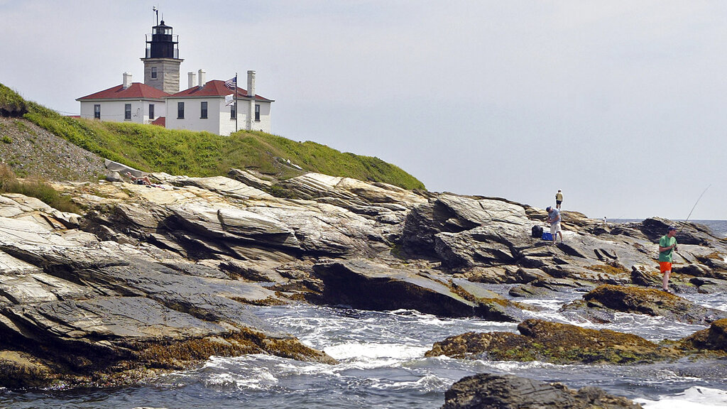 FILE - In this July 7, 2006, file photograph, fishermen cast on the rocky shore at the Beavertail Lighthouse, the third-oldest lighthouse in America, at the tip of Beavertail State Park, on Narragansett Bay, in Jamestown, R.I. The federal government's General Services Administration announced the U.S. Coast Guard has decided it no longer needs four of the nation's most storied and picturesque lighthouses, including the Beavertail Lighthouse. The government says it'll make the historic lighthouses and their outbuildings available at no cost to federal, state and local agencies; nonprofit organizations; educational and community development agencies; or groups devoted to parks, recreation, culture, or historic preservation. (AP Photo/Stew Milne, File)