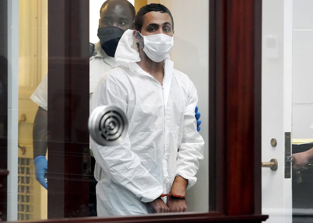 Khaled Awad is led into court while arraigned on charges in the stabbing of a rabbi near a Jewish day school, in Brighton District Court in Boston, Friday July 2, 2021. Rabbi Shlomo Noginski is in “stable condition and in good spirits" after being stabbed several times in the arm, Rabbi Dan Rodkin, executive director of Shaloh House, posted on Facebook. (Mary Schwalm/The Boston Herald via AP, Pool)