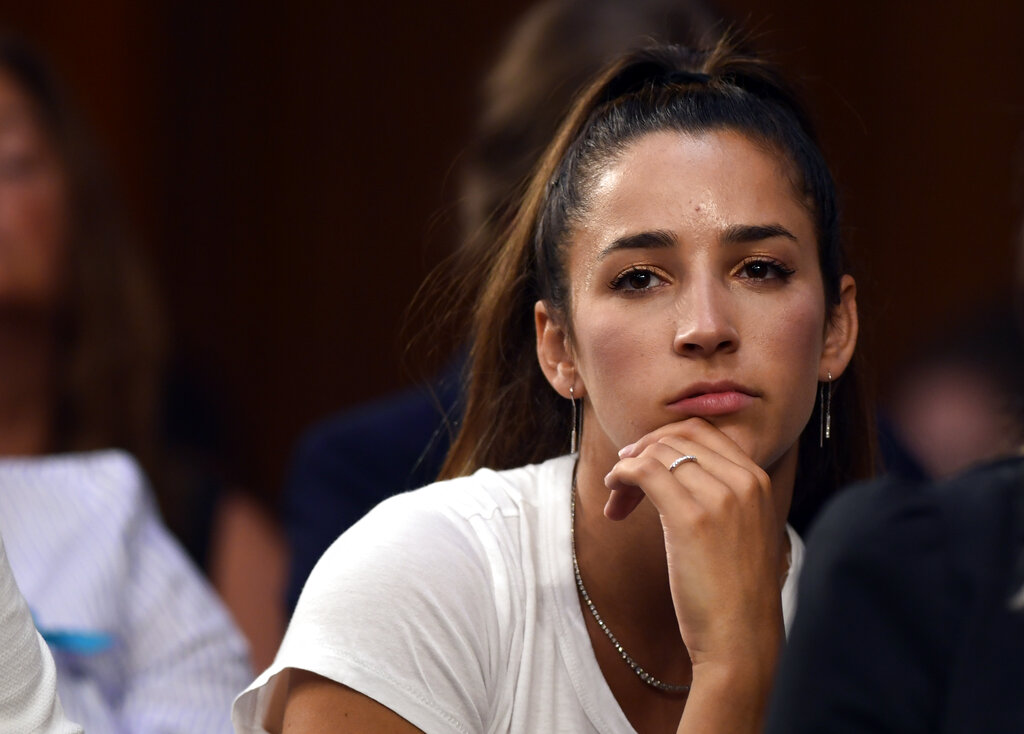 FILE - In this July 24, 2018 file photo, Olympic gold medalist Aly Raisman listens to testimony during a Senate Commerce subcommittee hearing in Washington. Raisman is looking for her beloved dog, who ran away scared during a weekend fireworks show in Boston. "My dog Mylo was terrified of fireworks and ran off," she tweeted Saturday, July 3, 2021, "He has a tag on and a leash. Please let me know if you see him." (AP Photo/Susan Walsh, File)