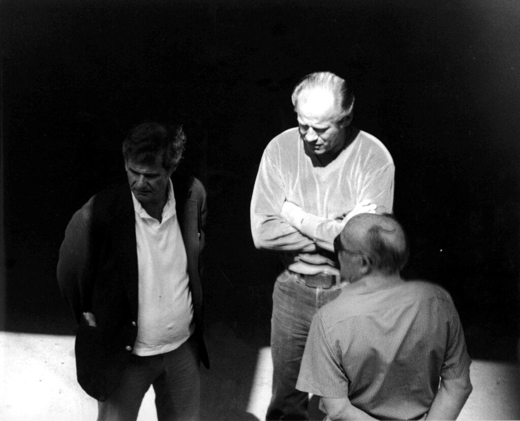 This 1980 black and white surveillance photo released by the U.S. Attorney's Office and presented as evidence during the first day of a trial for James "Whitey" Bulger in U.S. District Court in Boston, Wednesday, June 12, 2013, shows Bulger, center, with Ted Berenson, left, and Phil Wagenheim at a Lancaster Street garage in Boston's North End. Three years after he was bludgeoned to death in a West Virginia prison, no one has been charged in the beating death of murderous Boston crime boss James "Whitey" Bulger. Bulger was 89 when he was fatally beaten in October 2018. (AP Photo/U.S. Attorney's Office)