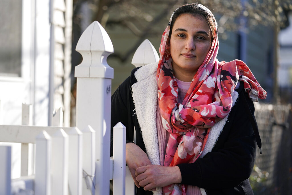 Haseena Niazi, a 24-year-old from Afghanistan, poses outside her home, Friday, Dec. 17, 2021, north of Boston. Niazi received a letter from the federal government denying her fiancé's humanitarian parole application earlier in the month. Her fiance, who she asked not to be named over concerns about his safety, had received threats from Taliban members for working on women's health issues at a hospital north of Kabul. (AP Photo/Charles Krupa)
