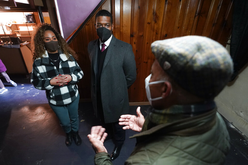 Tilicia Owens and Environmental Protection Agency Administrator Michael Regan, center, listen to Detroit Water and Sewerage Department director Gary Brown in her basement Friday, Feb. 18, 2022, in Detroit. They discussed the city’s $15 million effort to provide flood prevention pumps and other equipment in 11 neighborhoods. Part of the money will come from the $350 billion Coronavirus State and Local Fiscal Recovery Funds which can be used by states, counties and cities to recover from the pandemic and can be used for everything from job creation to child care to housing. (AP Photo/Paul Sancya)
