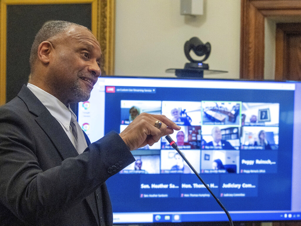 District Court Judge Rick Lawrence speaks before the Judiciary Committee during his confirmation hearing to become an associate justice on the Maine Supreme Judicial Court, Friday April 8, 2022, at the Maine State House in Augusta, Maine. If confirmed, he would be the first Black person to serve on Maine's highest court. (Joe Phelan/The Kennebec Journal via AP)