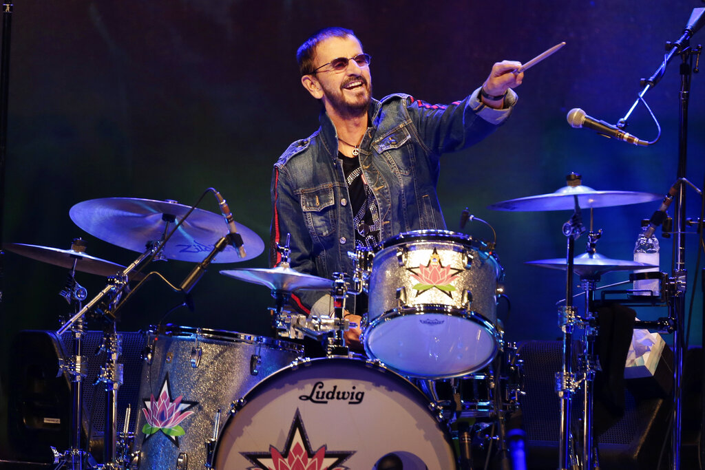 FILE - Ringo Starr plays as part of a concert celebrating the 50th anniversary of Woodstock in Bethel, N.Y., Aug. 16, 2019. Starr will receive an honorary degree Thursday, June 2, 2022, from Berklee College of Music in Boston. (AP Photo/Seth Wenig, File)