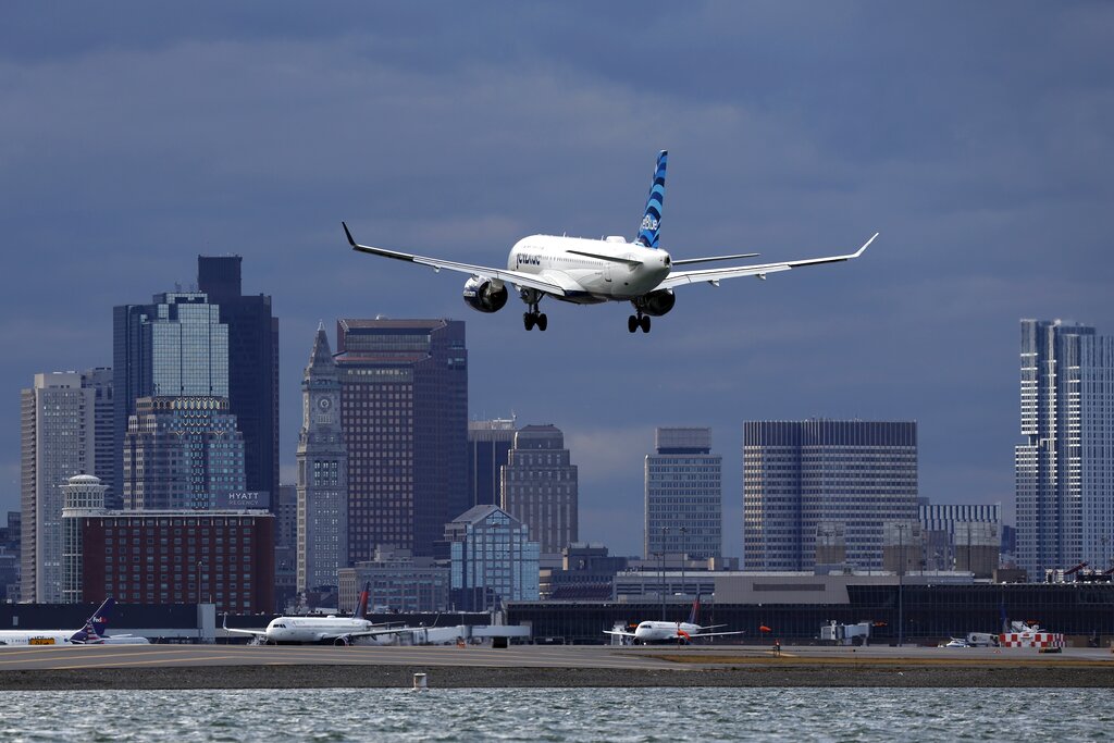 FILE - A JetBlue plane lands at Logan International Airport, Thursday, Jan. 26, 2023, in Boston. Federal officials are investigating a string of close calls between planes, including one this week at Logan. (AP Photo/Michael Dwyer, File)