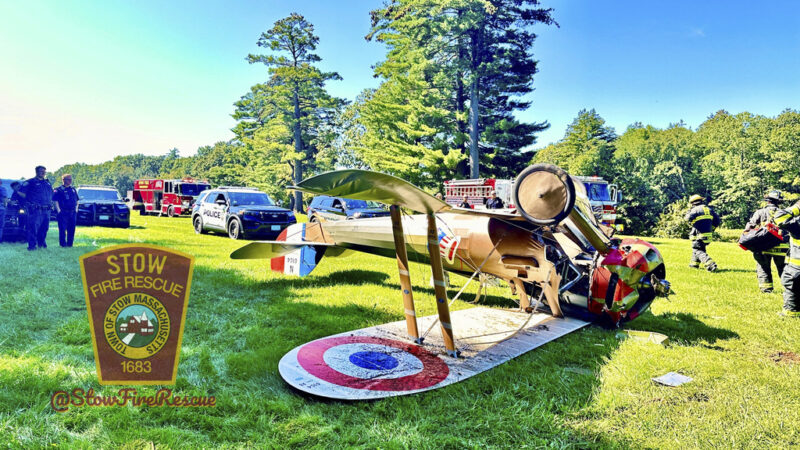 STOW, Mass. (AP) — A World War I-era plane crashed and flipped over onto its roof as the pilot tried to land outside of a military history museum in Massachusetts, authorities said Sunday. The pilot was not hurt.