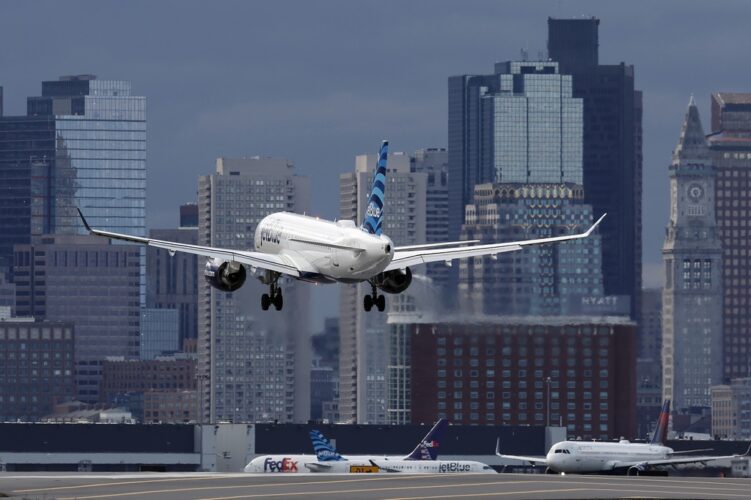 BOSTON (AP) — A person on board a plane at Boston Logan International Airport that was taxiing for takeoff suddenly opened an exit door and was quickly restrained by other passengers, authorities said.