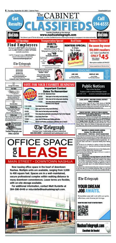 Cabinet Legals 9/25/2025 By Staff | Sep 29, 2025 C092525-A08 NewsletterToday's breaking news and more in your inboxEmail(Required) I'm interested in (please check all that apply)(Required) Daily Newsletter Breaking News Obituaries Are you a paying subscriber to the newspaper?(Required) Yes No Public Notice Telegraph Legals B 9/28/2025 Telegraph Legals A 9/28/2025 Cabinet Legals 9/25/2025