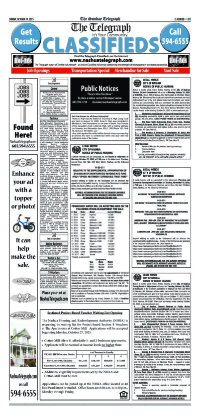 Telegraph Legals 10/19/2025 By Staff | Oct 17, 2025 T101825-B11 NewsletterToday's breaking news and more in your inboxEmail(Required) I'm interested in (please check all that apply)(Required) Daily Newsletter Breaking News Obituaries Are you a paying subscriber to the newspaper?(Required) Yes No Public Notice Telegraph Legals 10/19/2025 Telegraph Legals 10/12/2025 Cabinet Legals 10/9/2025