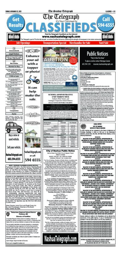 Telegraph Legals 11/23/2025 By Staff | Nov 21, 2025 T112325-B11 (1) NewsletterToday's breaking news and more in your inboxEmail(Required) I'm interested in (please check all that apply)(Required) Daily Newsletter Breaking News Obituaries Are you a paying subscriber to the newspaper?(Required) Yes No Public Notice Telegraph Legals 11/23/2025 Cabinet Legals 11/20/2025 Telegraph Legals 11/16/2025