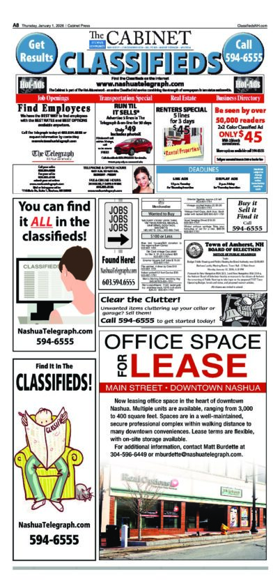 Cabinet Legals 1/1/2026 By Staff | Dec 31, 2025 C010126-A08 Public Notice Cabinet Legals 1/1/2026 Cabinet Legals 12/25/2025 Cabinet Legal 12/18/2025