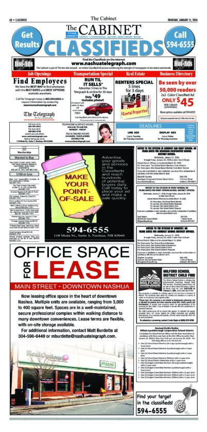 Cabinet Legals 1/15/2026 By Staff | Jan 17, 2026 C011526-A08 NewsletterToday's breaking news and more in your inboxEmail(Required) I'm interested in (please check all that apply)(Required) Daily Newsletter Breaking News Obituaries Are you a paying subscriber to the newspaper?(Required) Yes No Public Notice Telegraph Legals 1/18/2026 Cabinet Legals 1/15/2026 Milford Water Utilities