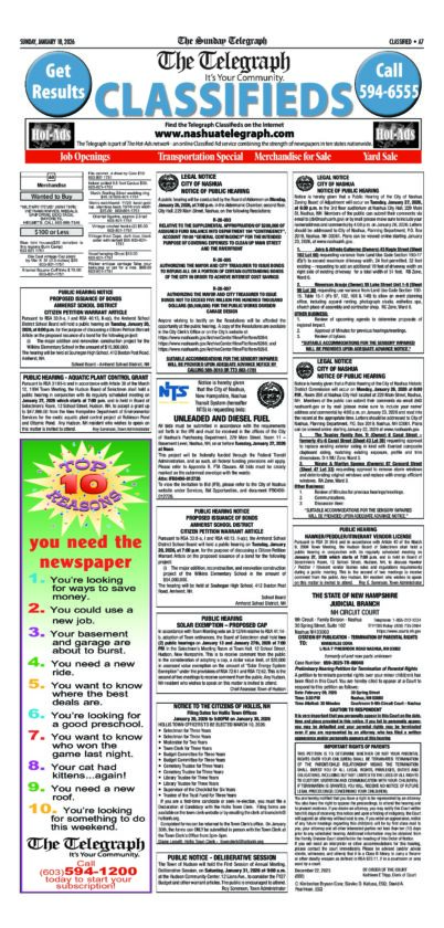 Telegraph Legals 1/18/2026 By Staff | Jan 17, 2026 T011726-A07 NewsletterToday's breaking news and more in your inboxEmail(Required) I'm interested in (please check all that apply)(Required) Daily Newsletter Breaking News Obituaries Are you a paying subscriber to the newspaper?(Required) Yes No Public Notice Telegraph Legals 1/18/2026 Cabinet Legals 1/15/2026 Milford Water Utilities