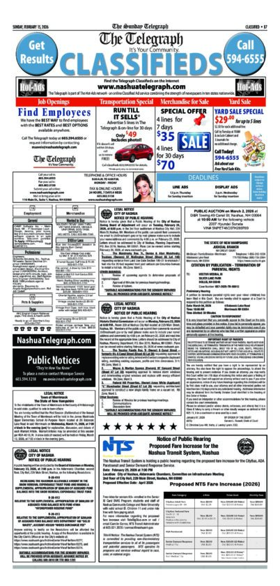 Telegraph Legals & Classifieds 2/15/2026 By Staff | Feb 12, 2026 T021426-B07 NewsletterToday's breaking news and more in your inboxEmail(Required) I'm interested in (please check all that apply)(Required) Daily Newsletter Breaking News Obituaries Are you a paying subscriber to the newspaper?(Required) Yes No Public Notice Cabinet Legals & Classifieds 2/12/2026 Telegraph Legals & Classifieds 2/15/2026 Cabinet Legals 2/5/2026