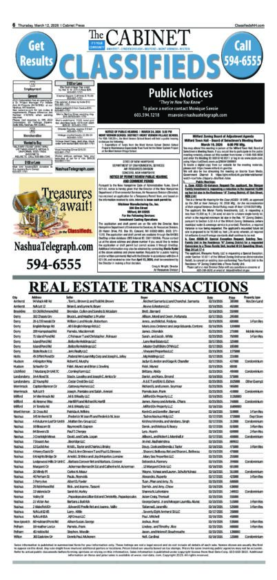 Cabinet Legals & Classifieds 3/12/2026 By Staff | Mar 13, 2026 C031226-A06 NewsletterToday's breaking news and more in your inboxEmail(Required) I'm interested in (please check all that apply)(Required) Daily Newsletter Breaking News Obituaries Are you a paying subscriber to the newspaper?(Required) Yes No Public Notice Telegraph Legals & Classifieds 3/15/2026 Cabinet Legals & Classifieds 3/12/2026 Telegraph Legals & Classifieds 3/8/2026