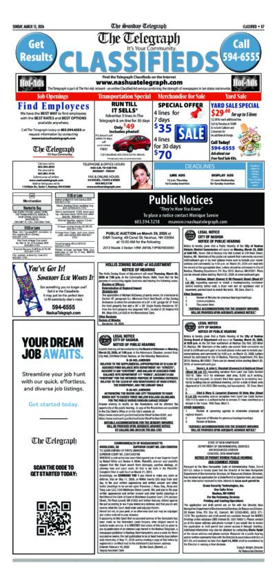 Telegraph Legals & Classifieds 3/15/2026 By Staff | Mar 13, 2026 T031426-B07 NewsletterToday's breaking news and more in your inboxEmail(Required) I'm interested in (please check all that apply)(Required) Daily Newsletter Breaking News Obituaries Are you a paying subscriber to the newspaper?(Required) Yes No Public Notice Telegraph Legals & Classifieds 3/15/2026 Cabinet Legals & Classifieds 3/12/2026 Telegraph Legals & Classifieds 3/8/2026