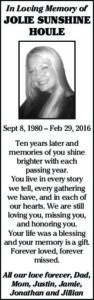 Jolie Sunshine Houle By Staff | Feb 26, 2026 Houle NewsletterToday's breaking news and more in your inboxEmail(Required) I'm interested in (please check all that apply)(Required) Daily Newsletter Breaking News Obituaries Are you a paying subscriber to the newspaper?(Required) Yes No Memorials Jolie Sunshine Houle James Townsend Jessica Jo Smith