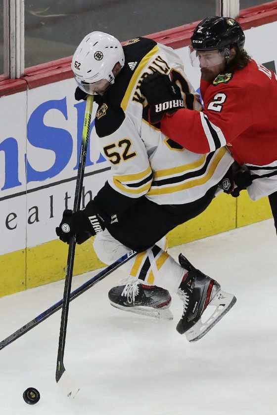 Boston Bruins center Sean Kuraly, left, is defended by Chicago Blackhawks defenseman Duncan Keith during the second period of an NHL hockey game in Chicago, Wednesday, Feb. 5, 2020. (AP Photo/Nam Y. Huh)