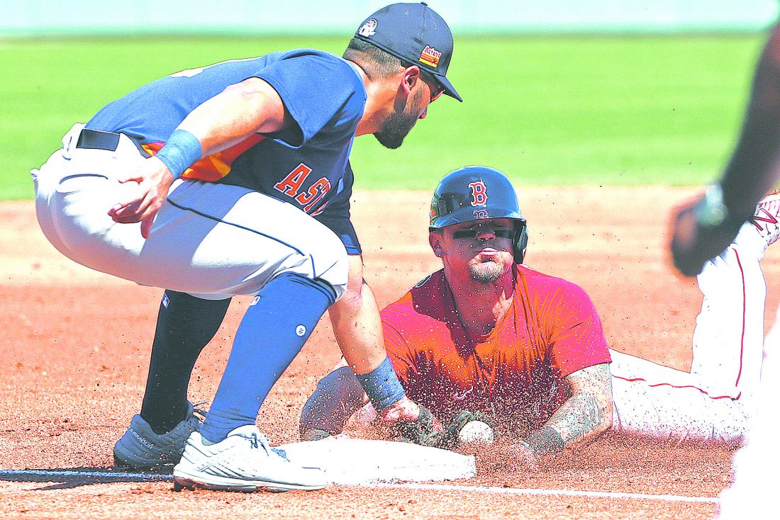 Houston Astros third baseman Abraham Toro tags Boston Red Sox's Michael Chavis who is out trying to steal third during a spring training baseball game, Thursday, March 5, 2020, in Fort Myers, Fla. (AP Photo/Elise Amendola)