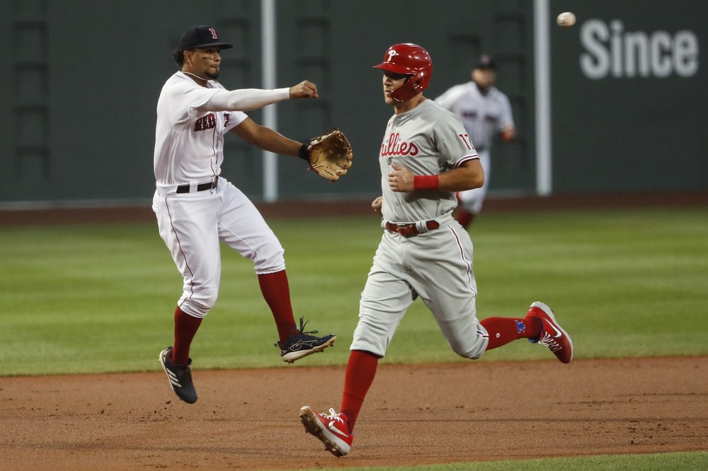 AP photo Boston Red Sox shortstop Xander Bogaerts throws past Philadelphia Phillies' Rhys Hoskins to get out J.T. Realmuto at first base during the first inning of Tuesday night's game at Fenway Park.