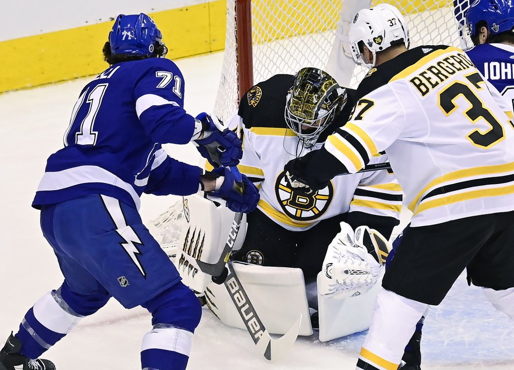 AP photo Boston Bruins goaltender Jaroslav Halak, second from left, makes a save against Tampa Bay Lightning center Anthony Cirelli (71) as Bruins' Patrice Bergeron (37) defends during first-period Stanley Cup Eastern Conference playoff action Sunday night in Toronto