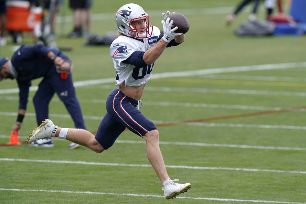 AP photo New England Patriots wide receiver Gunner Olszewski (80) catches a pass during a recent training camp practice in Foxoborough. He's one of the p;layers fighting for a spot on the roster.
