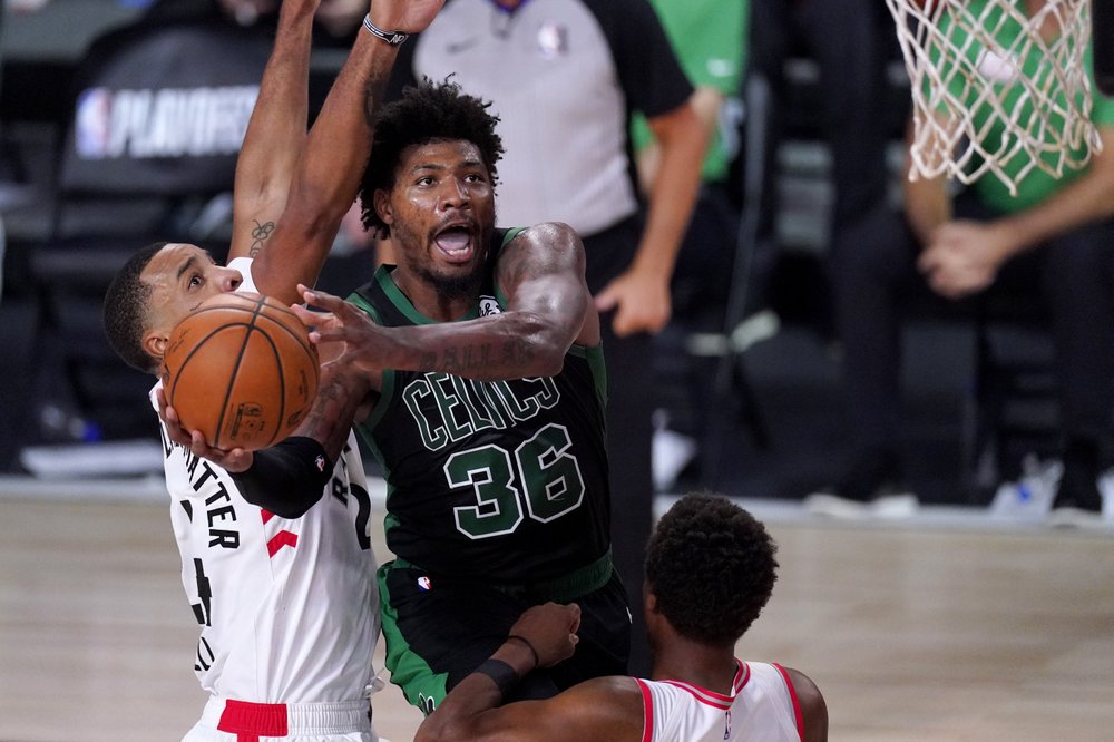 AP photoBoston Celtics' Marcus Smart (36) goes up for a shot against Toronto Raptors' Norman Powell, left, and Kyle Lowry during the second half of Game 7 of the Eastern Conference semifinals Friday,