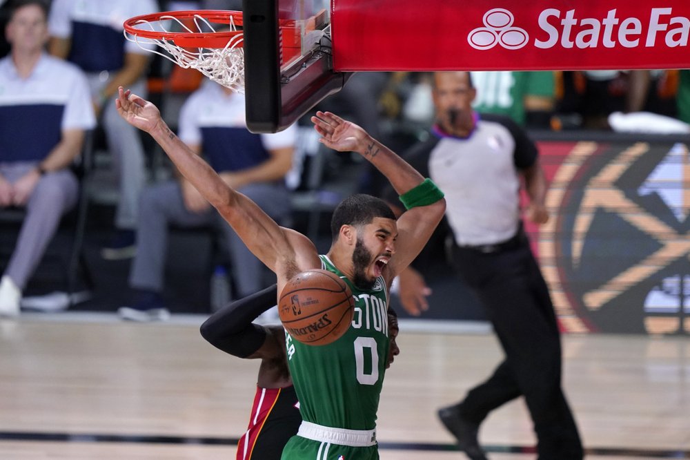 AP photo Boston Celtics' Jayson Tatum (0) celebrates dunking in front of Miami Heat's Kendrick Nunn, rear, during the second half of Saturday night's Game 3 of the Eastern Conference Finals.