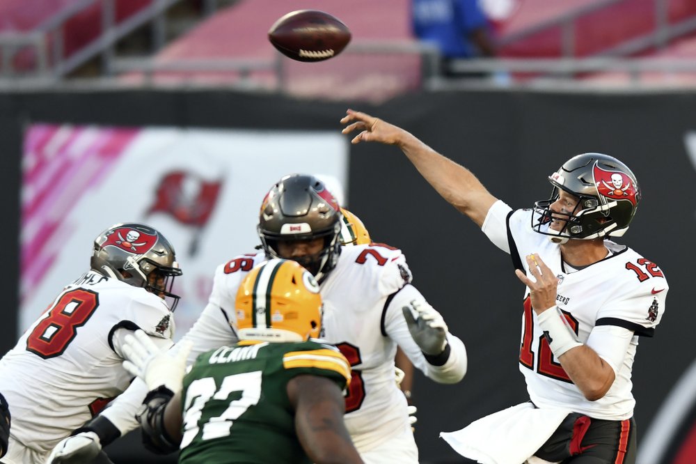 Tampa Bay Buccaneers quarterback Tom Brady (12) throws a pass against the Green Bay Packers during the second half of an NFL football game Sunday, Oct. 18, 2020, in Tampa, Fla. (AP Photo/Jason Behnken)